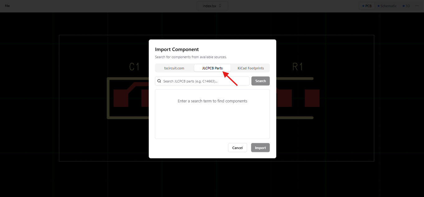 The easiest way to import JLCPCB components is using the editor's built-in import dialog when running tsci dev. This provides a modern search interface with real-time stock information.